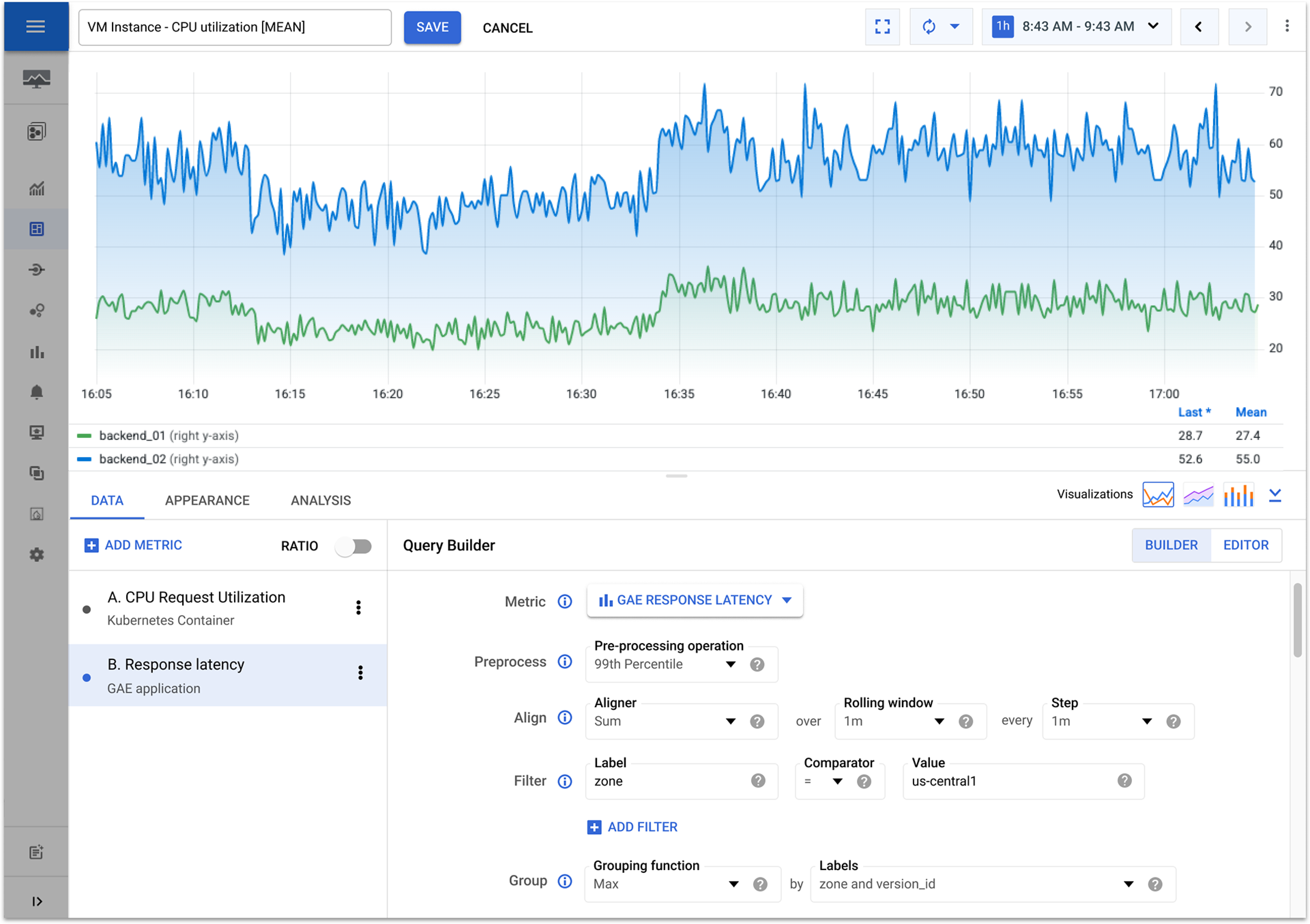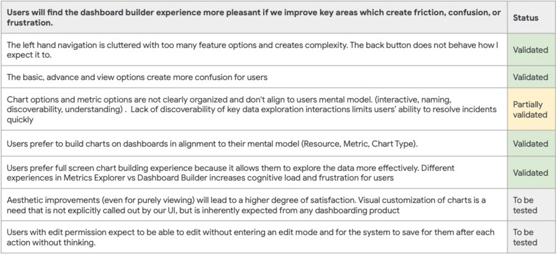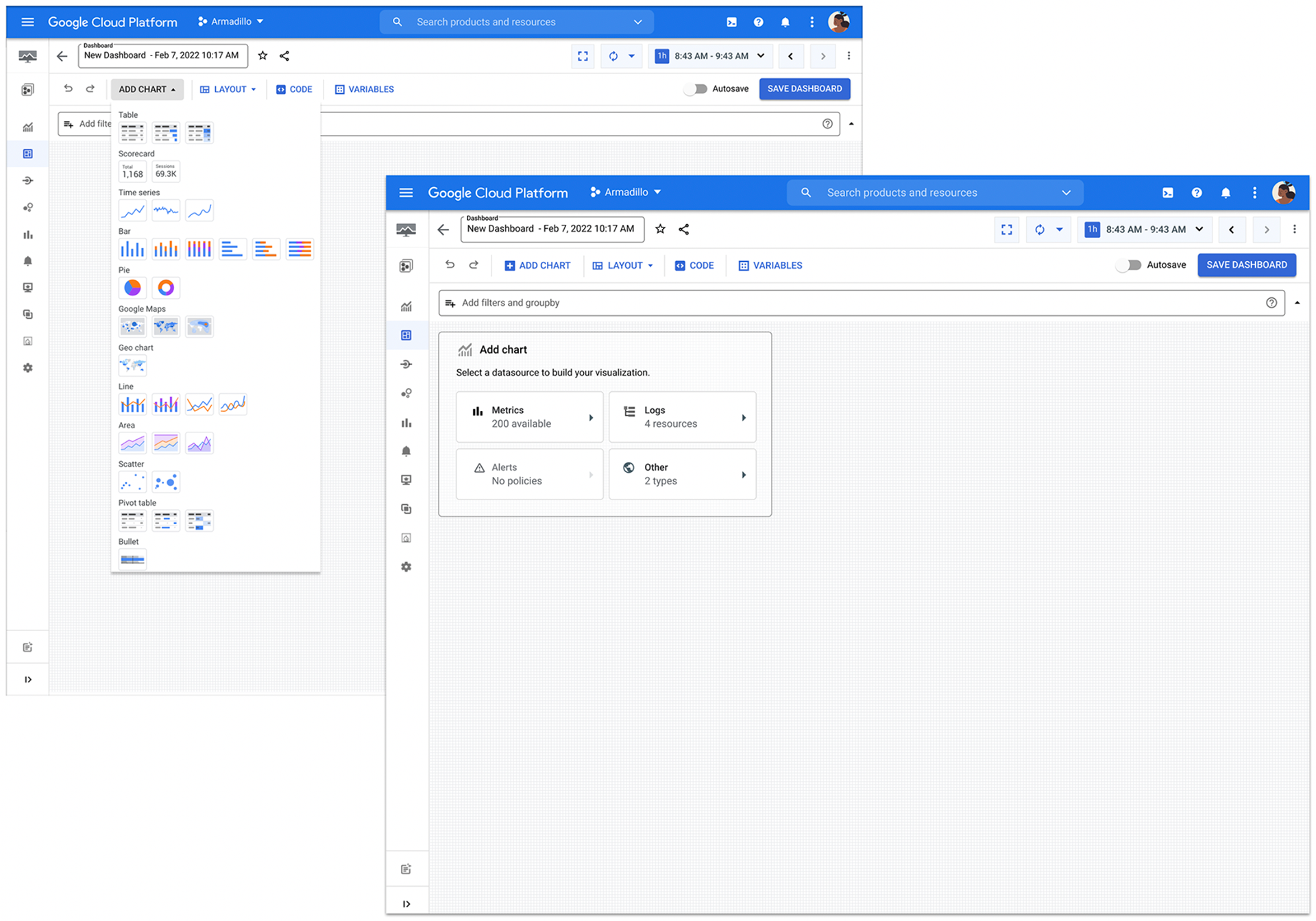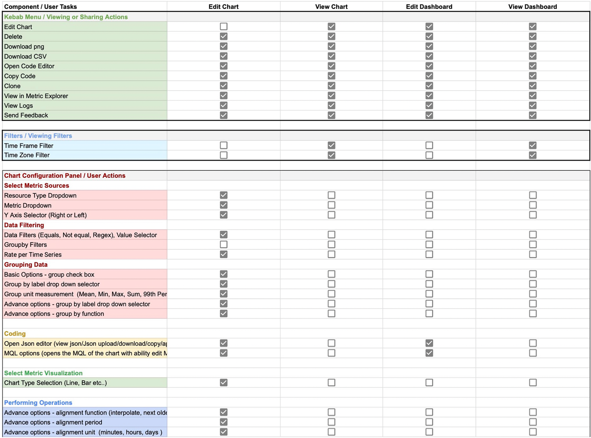 The Google Cloud monitoring product serves a wide variety of personas ranging between highly technical coders to lower tech analysts. The product needs to be rich with features that are customizable yet easy to use. Since the new feature additions have grown rapidly, some of the UX best practices rules now need a holistic overhaul which means we are lifting multiple dependent features at once. The existing interface configures source data, charts and dashboards simultaneously creating more levels of complexity.