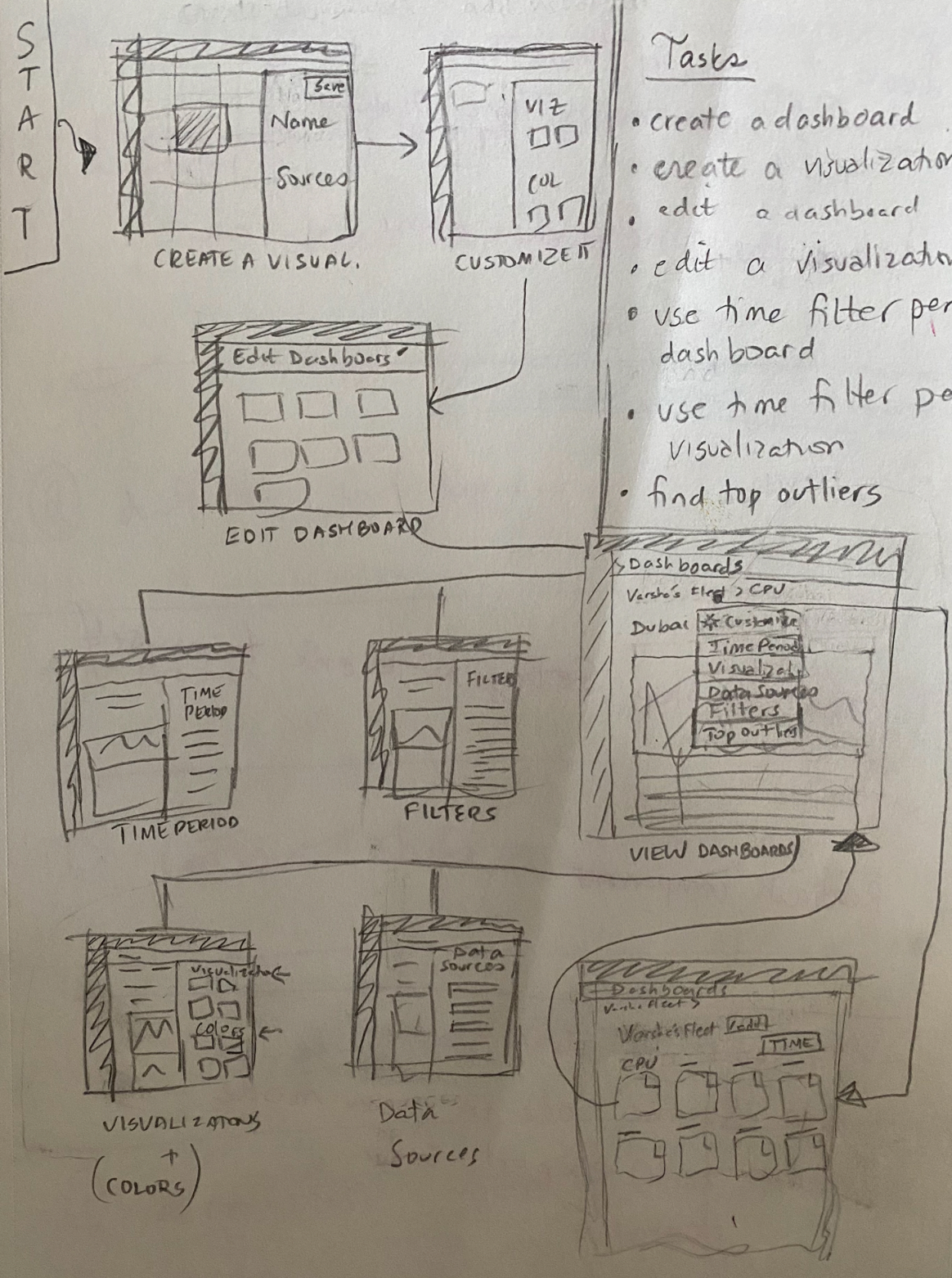 We started out with competitive research by fine combing through micro interactions available on Grafana and Datadog. We focused on the creation and visualization of charts since we knew that this area needs the greatest over haul. We then created keyframes working hand in hand with our user research team to better understand the mental model for users configuring a new chart. In addition to working with user research, we also created multiple feature information architecture clusters to ensure that feature types and components were consistent and easy to find.